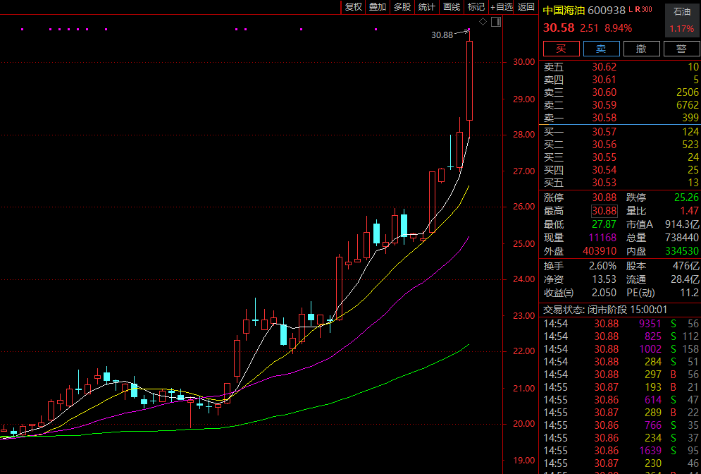今日午后,中国海油一度触及涨停,成交额超20亿元。公司最新市值近1.5万亿元,股价再创历史新高。
