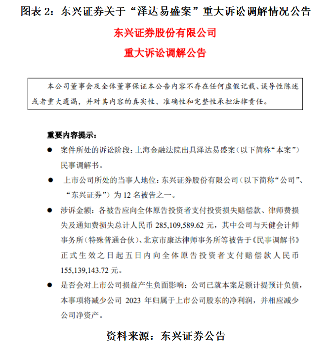 此外,受泽达易盛被投资者共同起诉一案影响,东兴证券在2023年12月27日发布公告称,该公司已于当年12月26日收到上海金融法院出具的《民事调解书》,应在《民事调解书》正式生效之日起五日内,与天健会计师事务所(特殊普通合伙)、北京市康达律师事务所等被告向全体原告投资者支付赔偿款1.55亿元。